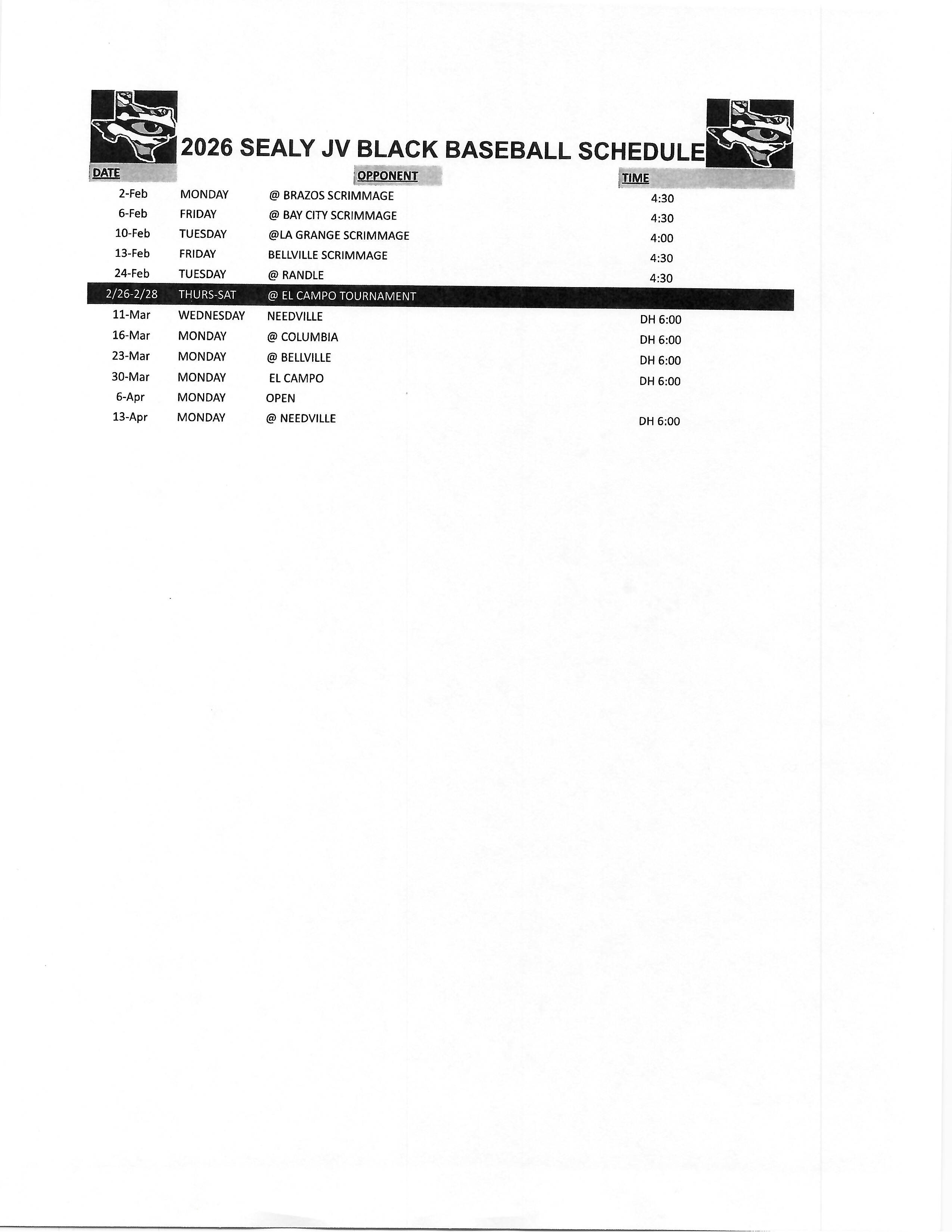 | 2026 Sealy JV Black Baseball Schedule |