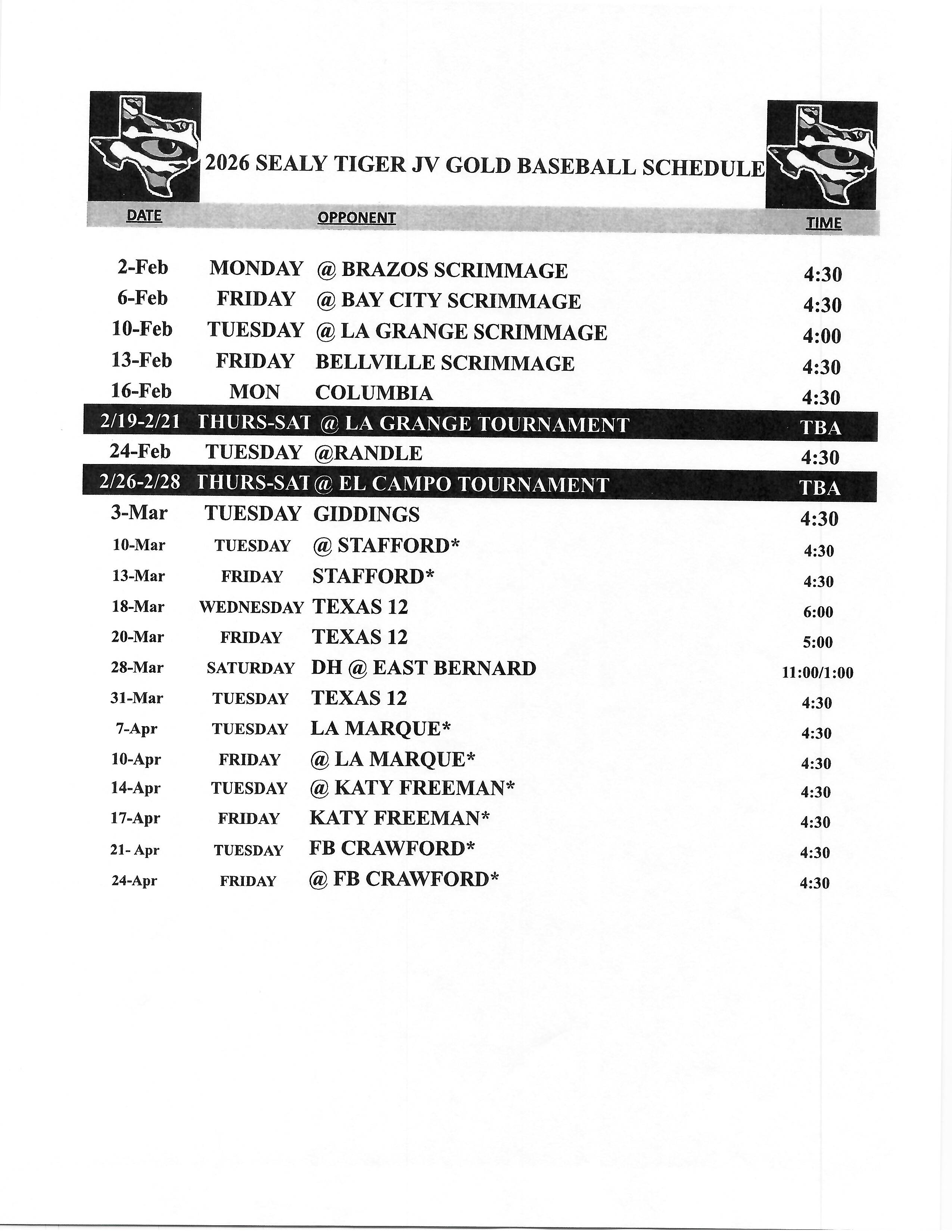 | 2026 Sealy JV Gold Baseball Schedule |