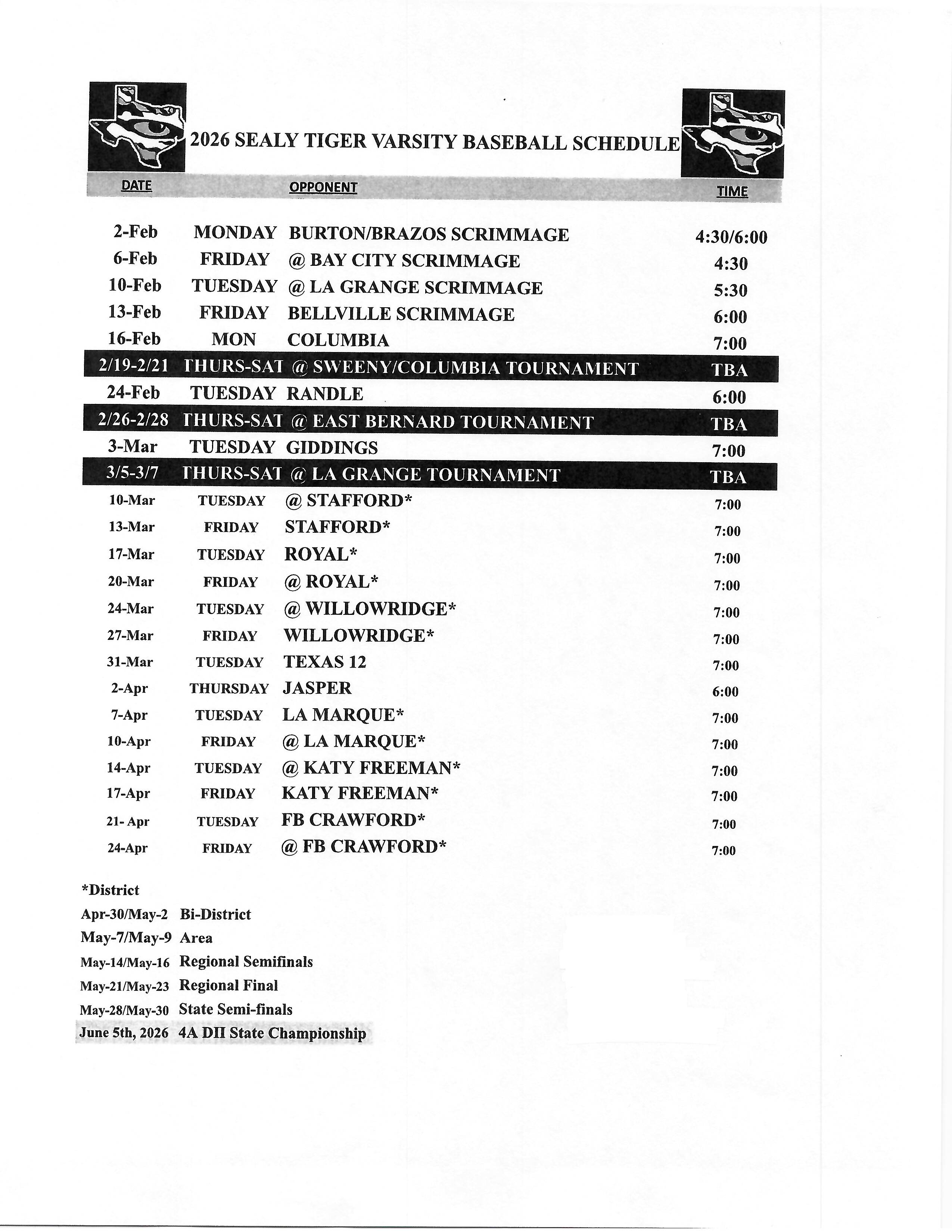 | 2026 Sealy Varsity Baseball Schedule |